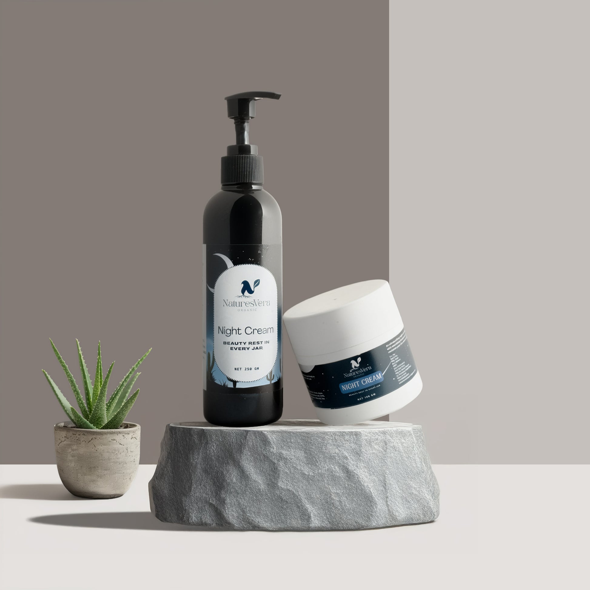 This rich Night Cream deeply nourishes and works through the night to restore skin elasticity, support renewal, and maintain hydration. Aloe Vera ensures lasting softness and youthful vitality by morning.